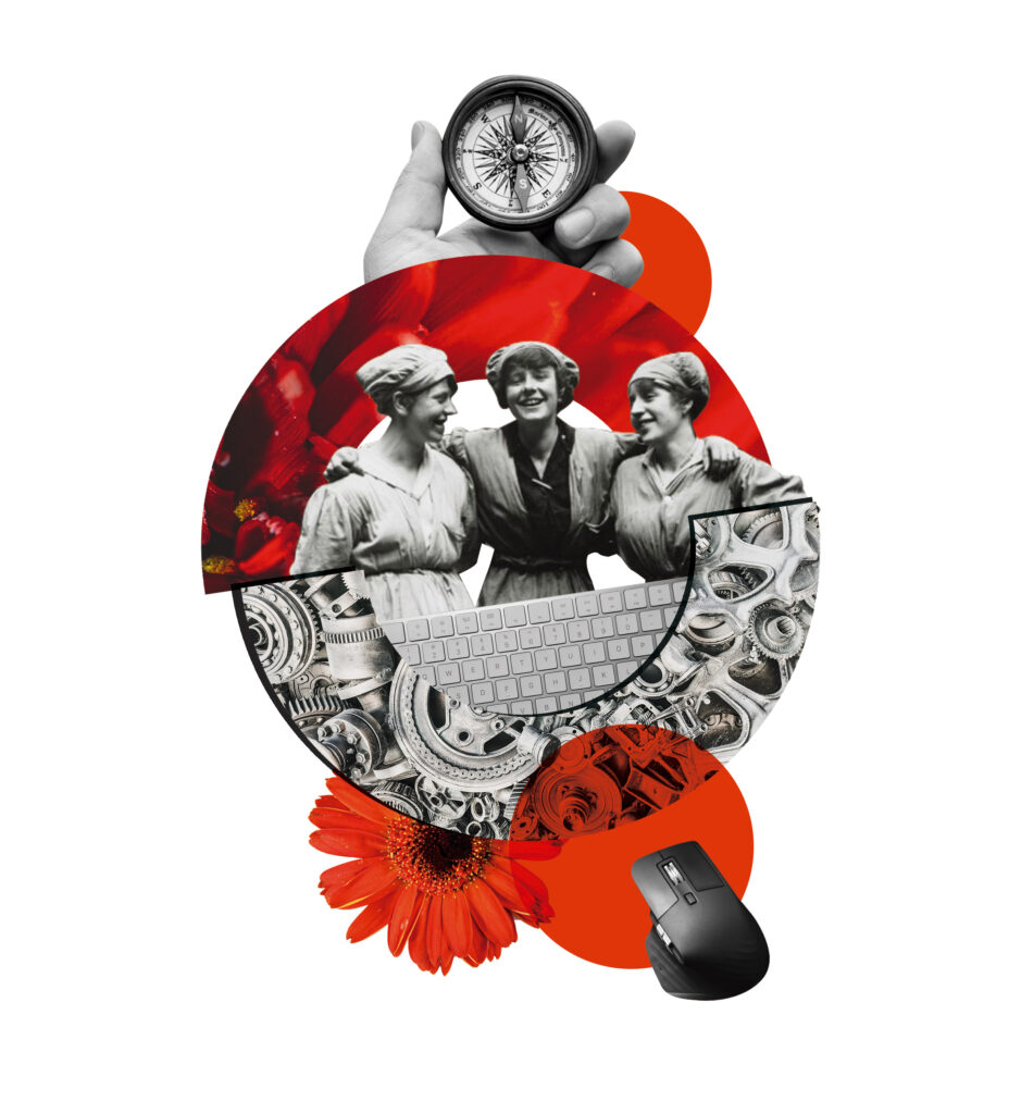 En dicho collage se representa los trabajos de producción en fábricas y los nuevos oficios más digitalizados, así como la continuidad y evolución de los derechos laborales y los ciclos de producción (círculo), la orientación laboral (brújula) y las mujeres trabajadoras (invisibilizadas históricamente).