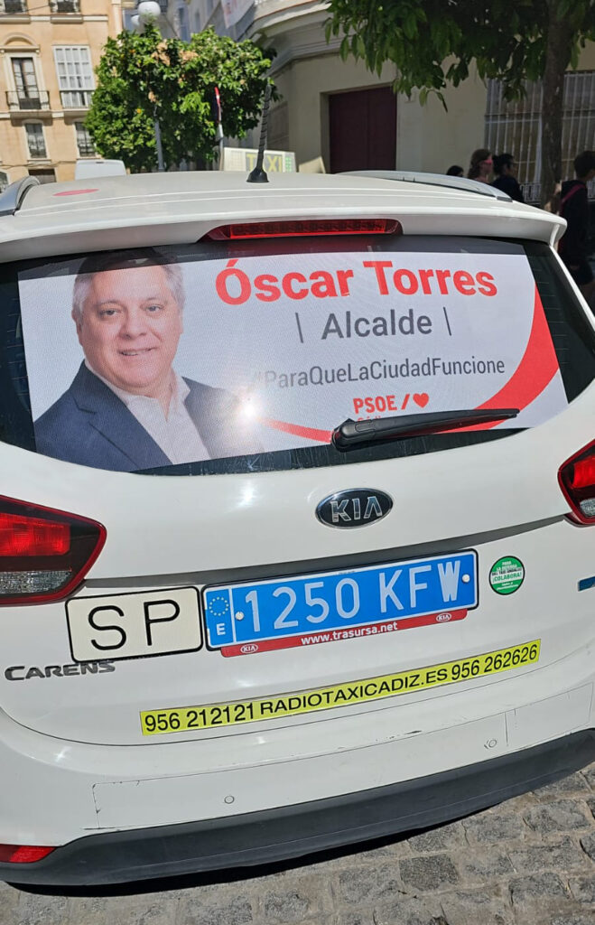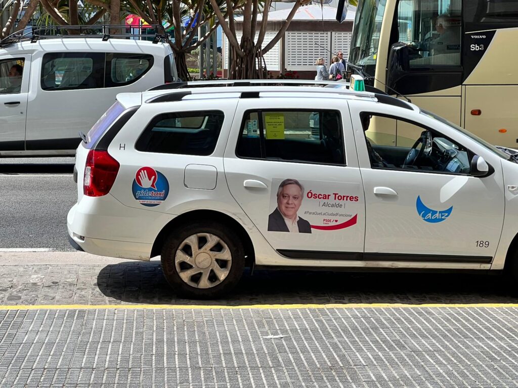 También convertimos los taxis en soportes publicitarios de gran alcance. Al estar en constante movimiento por las calles de Cádiz y ser un servicio público de gran alcance para la población cumplía un papel muy importante en la difusión de la campaña.