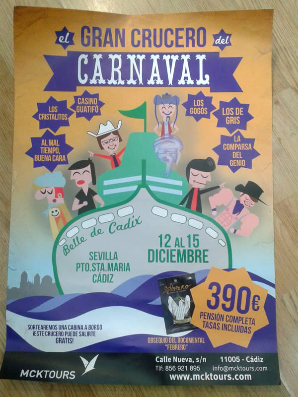 El resultado del cartel fue una divertida y alegre composición de ilustraciones alusivas a las agrupaciones de carnaval, a Cádiz en sí, y al barco. Además, se reflejaba el nombre de todas las agrupaciones participantes; un gancho para apuntarse, ya que había un sorteo para que el viaje te saliera gratis; info de la agencia turística MCK Tours; y el precio del crucero.